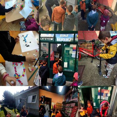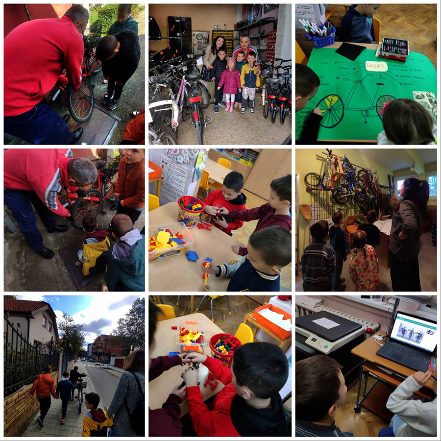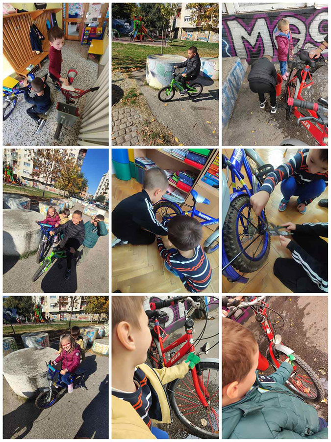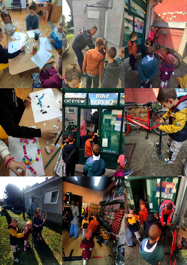 Посета сервису “Педала”, упознавање делова бицикла, поправка, посао мајстора.. Вожња, учешће у саобраћају..