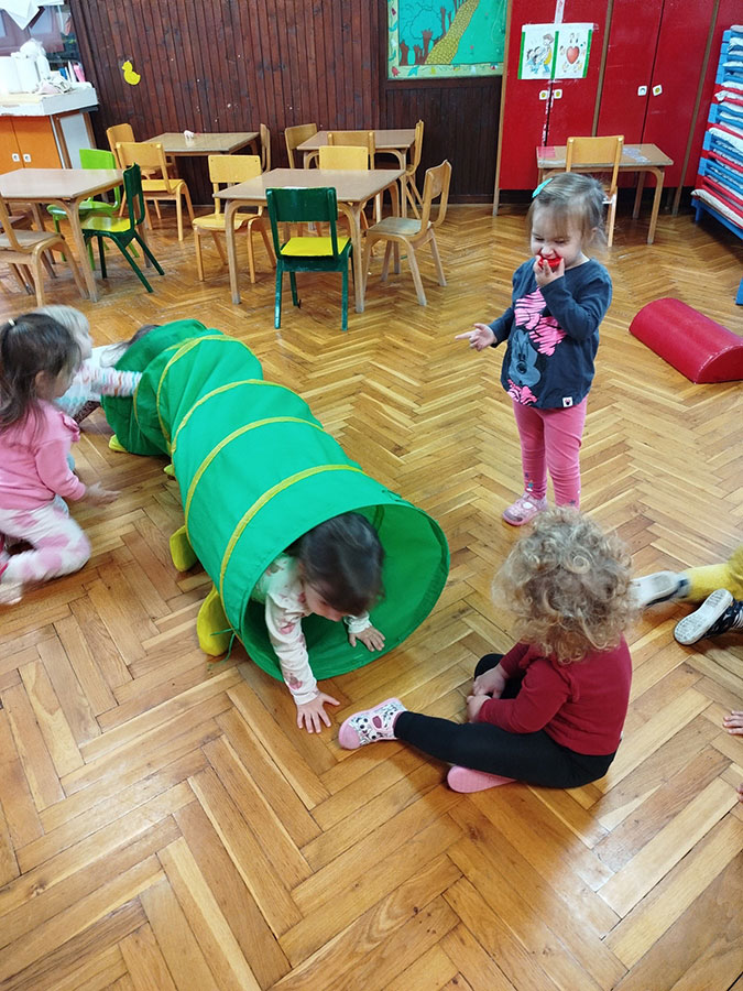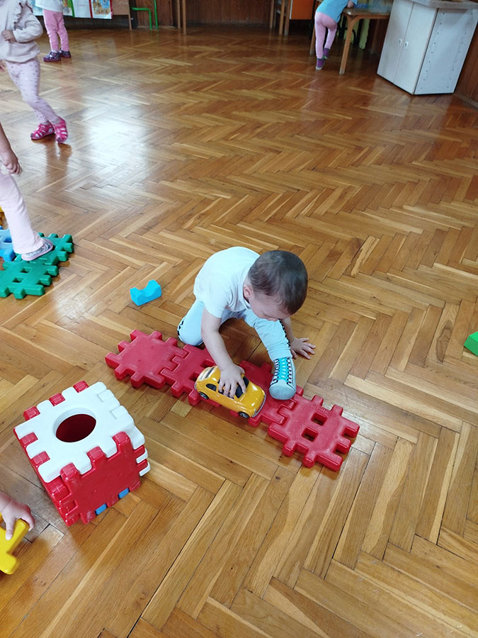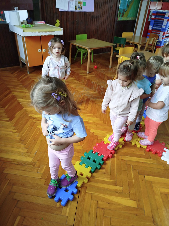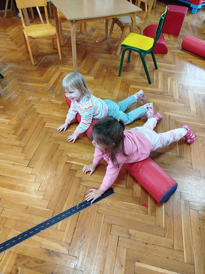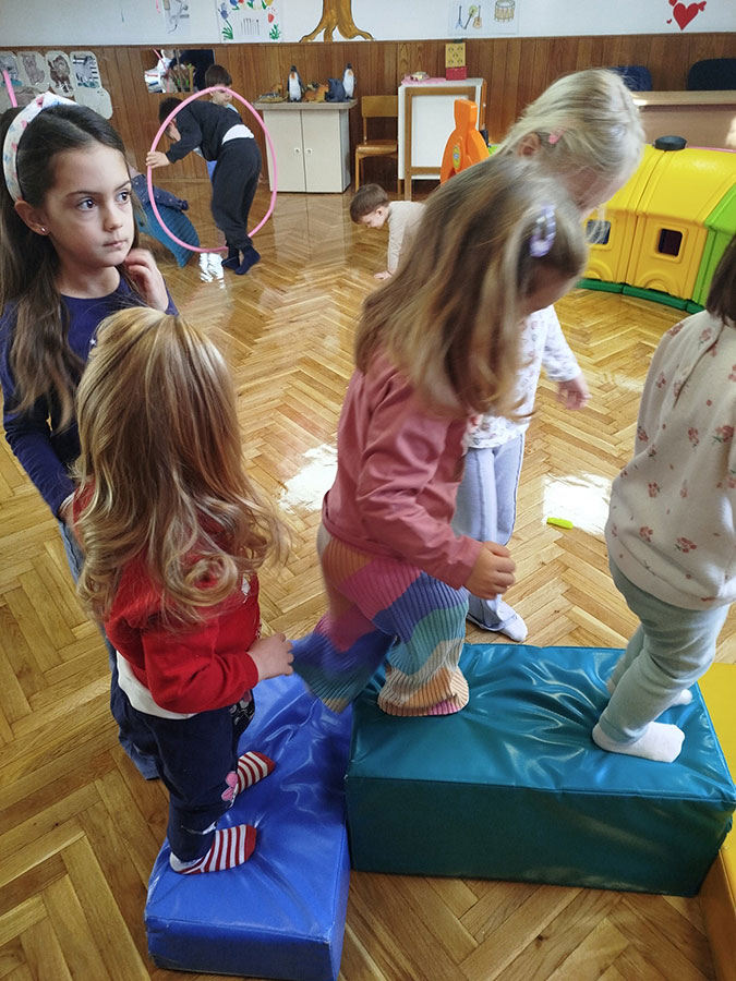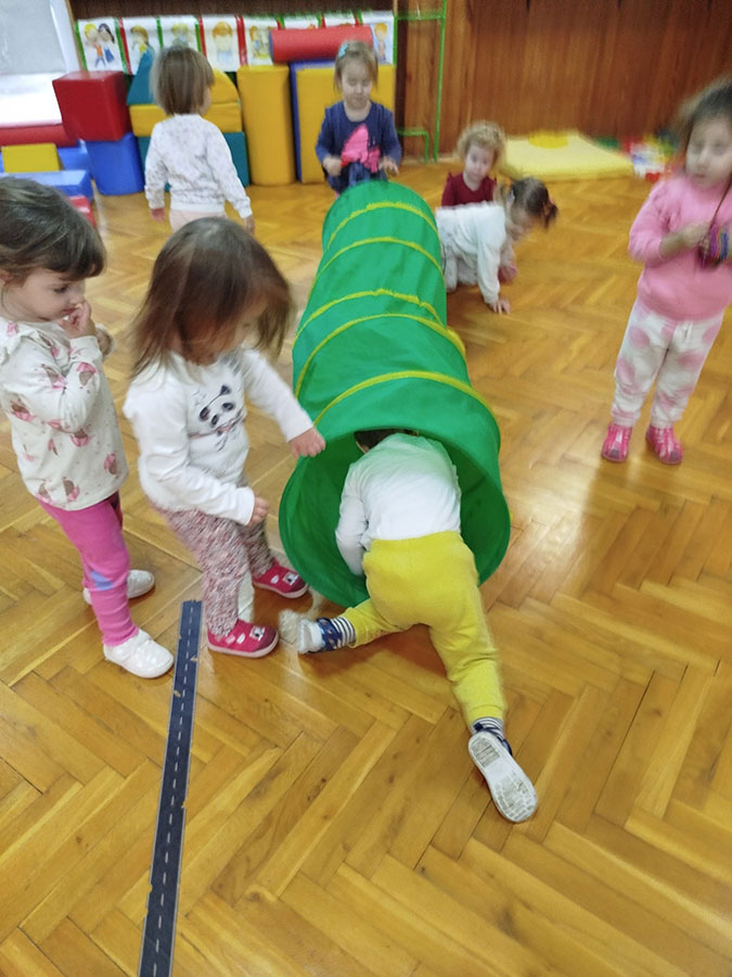 У разноврсним ситуацијама за учење, деца су савладавала полигоне, сачињене од меких и тврдих елемената.На тај начин су усавршавала координацију покрета, крупну моторику, учећи се тимском раду.