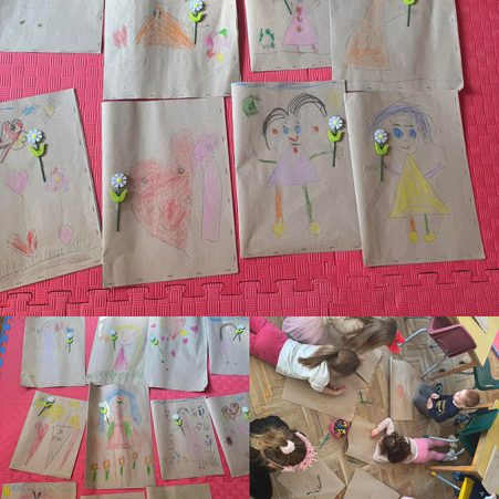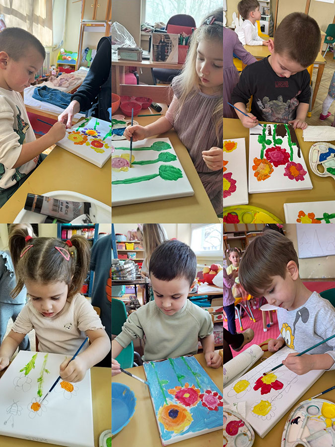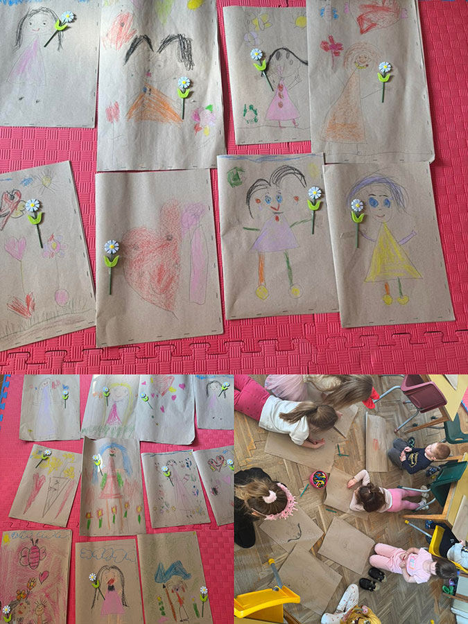 Мајка као најлеша бајка, у сусрет 8. марту. Технике: оловка, темпере, платно, натур папир и пастели. Средња група, васпитачице: Наташа К. и Бојана Л.