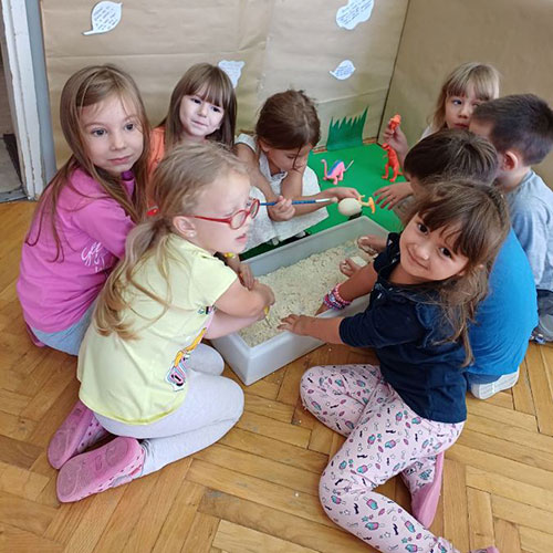 Вртић “Љиљан” Панчево Група: старија обданишна група Васпитачице: Светлана Стокиц, Сара Тубић Пројекат: Диносаурус Повод за почетак овог пројекта били су диносауруси које је један дечак сваки дан доносио у вртић и заједничка игра. Деца су показала велико интересовање и стално постављали нова питања. Разликовали смо врсте, откопавали и правили кости, скелет, учили о томе…