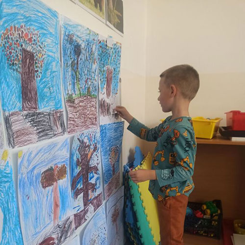 Васпитачи: Сејдовић Дијана, Војнов Љиљана Обрада теме “Просторне релације” у односу на дрво . Наставак пројекта “наше шуме”. Цртали смо дрво и тако поновили и утврдили већ стечено знање о деловима биљке.