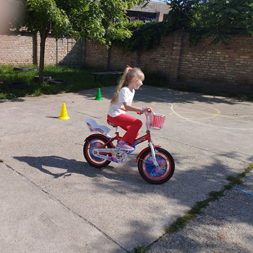 У оквиру пројекта “Саобраћај” најстарија група организвала је полигон у дворишту вртића. Полигон “Спретности”: вожња бициклом и тротинетом.
